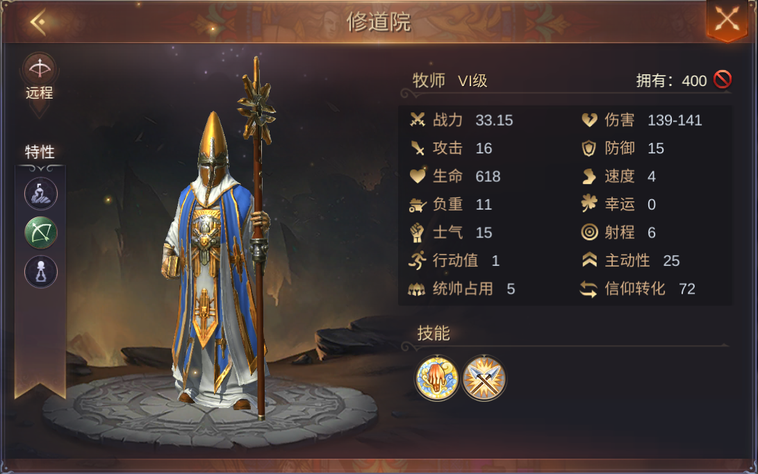 牧师是圣堂种族的中级兵种,领主大人们升级13级主城后即可解锁。牧师作为远程兵种,其攻击力较高,射程也比较远。游戏中期可以作为后排主力兵种。