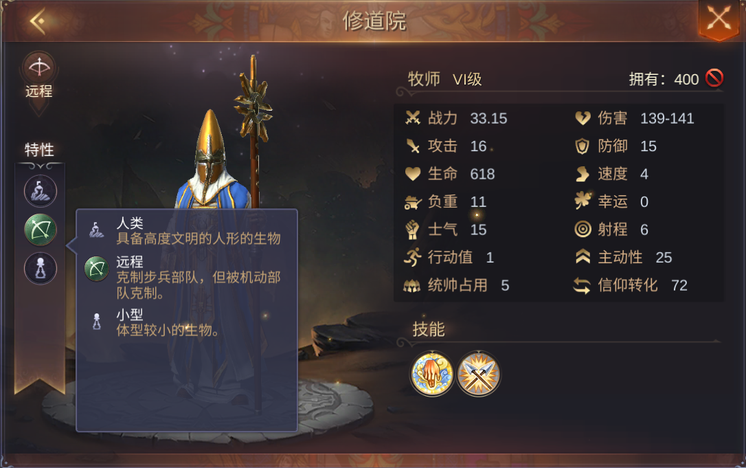 牧师拥有以下3种特性,分别是人类,远程,小型。