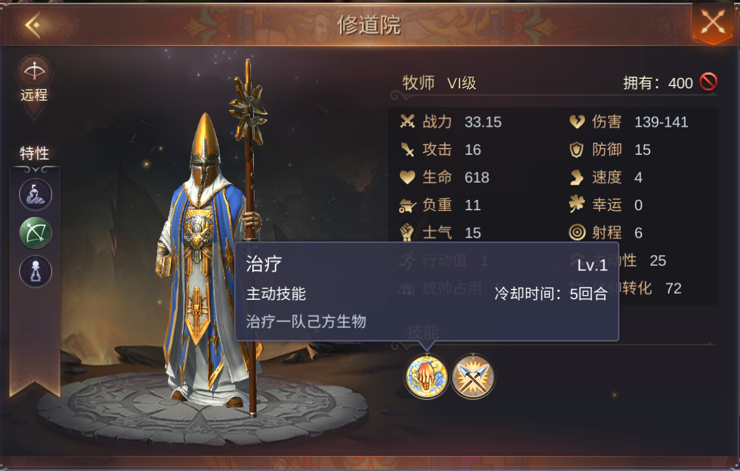 治疗是主动技能,冷却时间是5回合。可以治疗一队己方生物。牧师的这个技能可以有效降低领主大人们的战损。