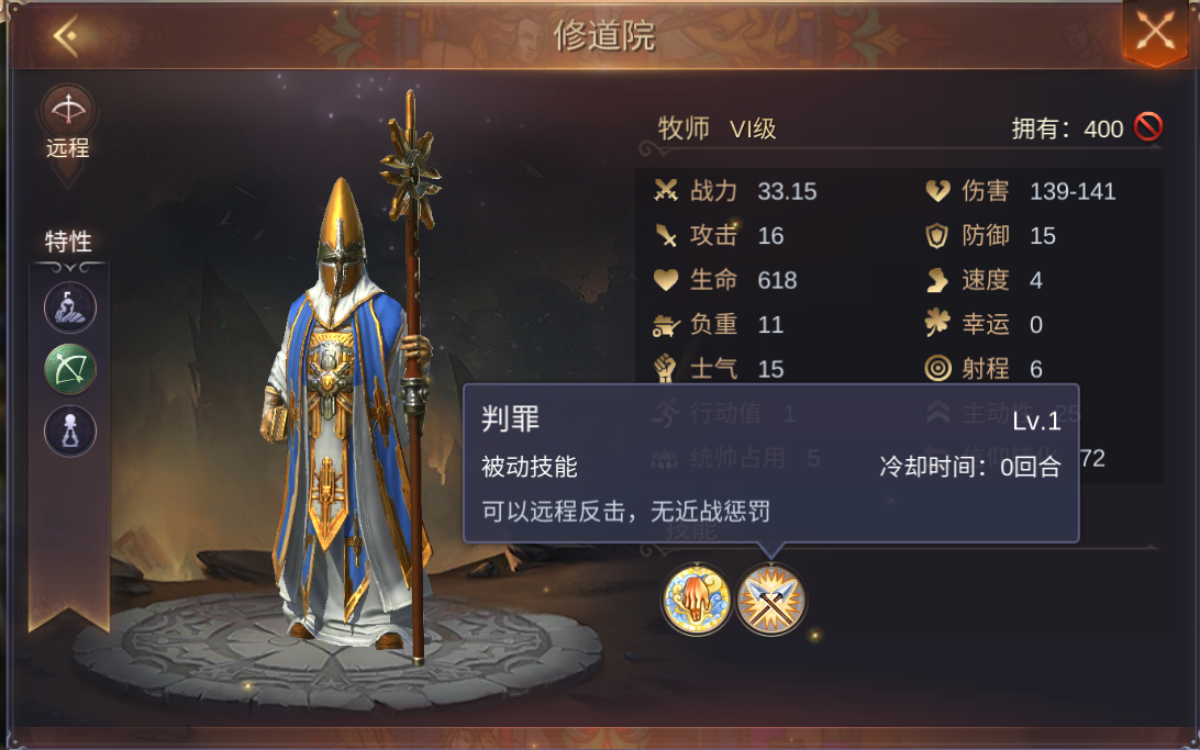 判罪是被动技能,可以远程反击,无近战惩罚。在《魔法门之英雄无敌:王朝》中,远程单位被近身后,反击是有近战惩罚的。而牧师可以无视这一点,可以更好地应对其他近战兵种。