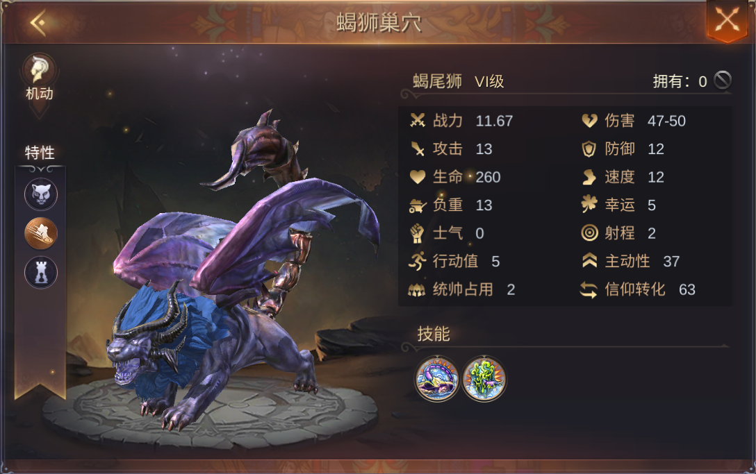 蝎尾狮拥有以下3种特性,分别是野兽,机动,中型。
