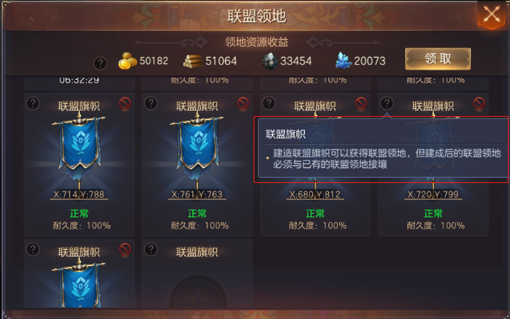 联盟旗帜可以扩大自己联盟的领地概括更多的联盟矿资源(10个旗帜以内消耗50k联盟积分,10~20消耗100k联盟积分,20以后消耗联盟资源,24k金币,24k木材,18k石头,7.2k水晶。),同时也可以接壤更多的中立建筑,为联盟获得更多的增益buff。在联盟里每天还可以领取大量的联盟资源收益,可谓是一举两得。建议前期插旗方式主要就是保证每张旗帜占领资源点,并且四种资源相对平均。然后往选好的中立建筑方向开始插。