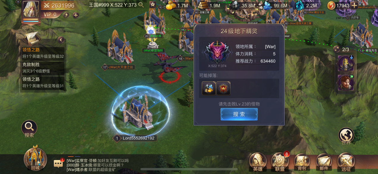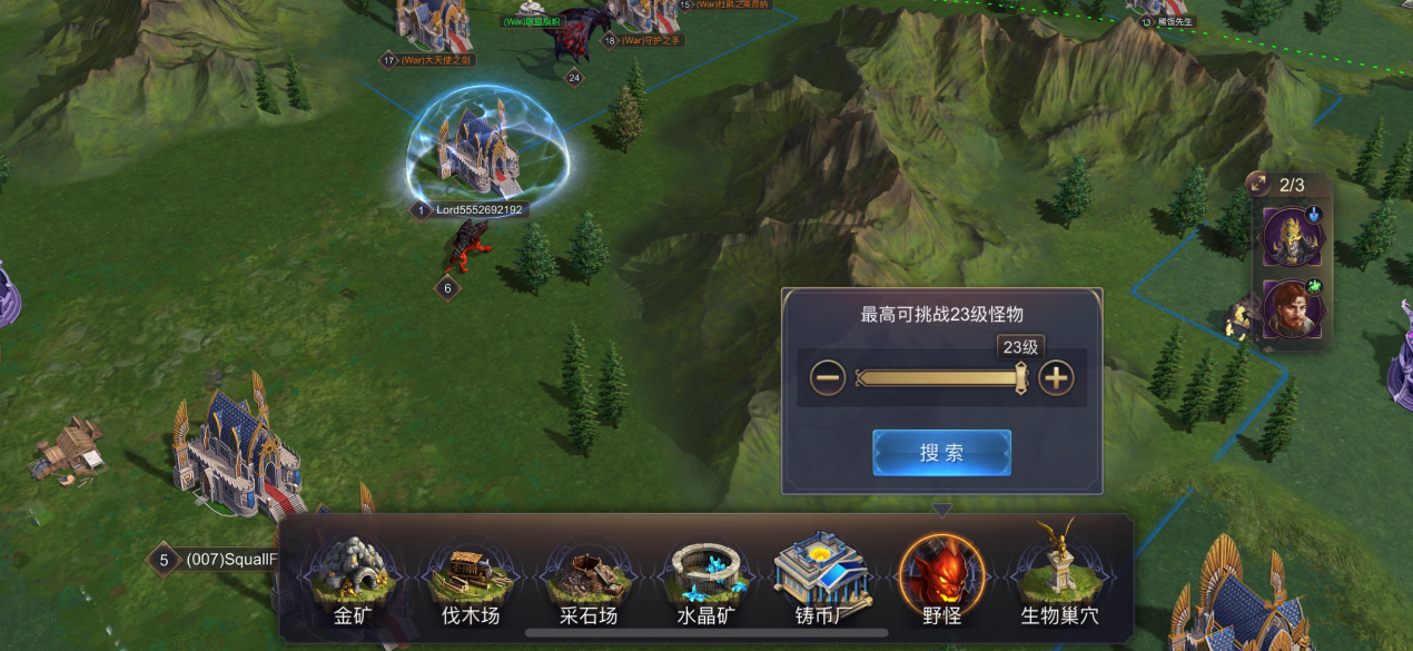 在城外点击搜索便能够找到城池周边的野怪,击杀这些野怪能够获得大量的资源。在搜索的时候诸位领主需要注意搜索野怪的等级,野怪的等级过低,那么战胜后获得的奖励自然也不会很高。要是太高了,可能诸位领主难以战胜。所以在搜索的过程中,诸位领主需要权衡一番,再进行搜索。