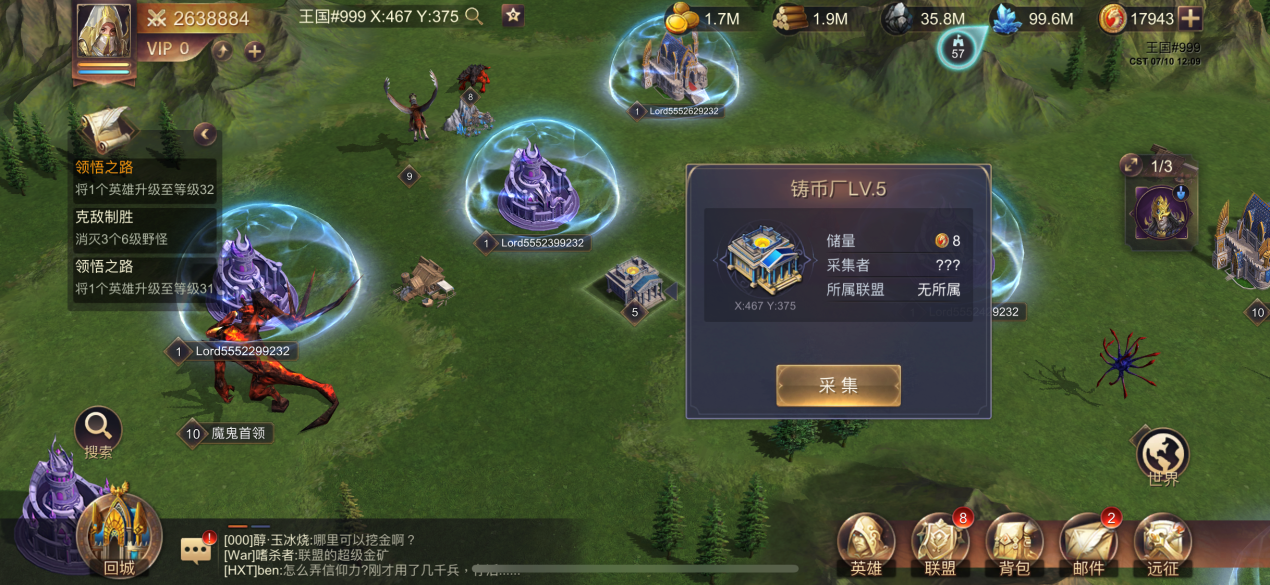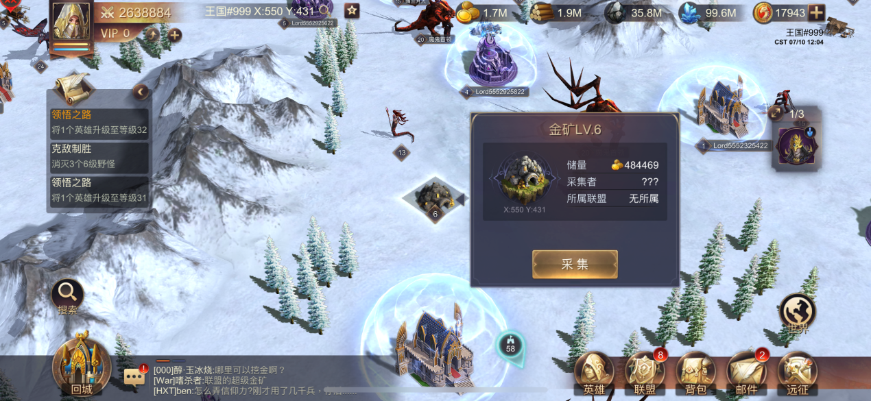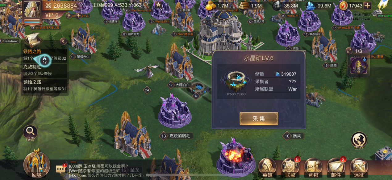 水晶是后期必不可少的资源,在野外通过搜索就能够搜寻到一级到七级的野外水晶矿场。点击采集派遣军队前去即可采集水晶资源。