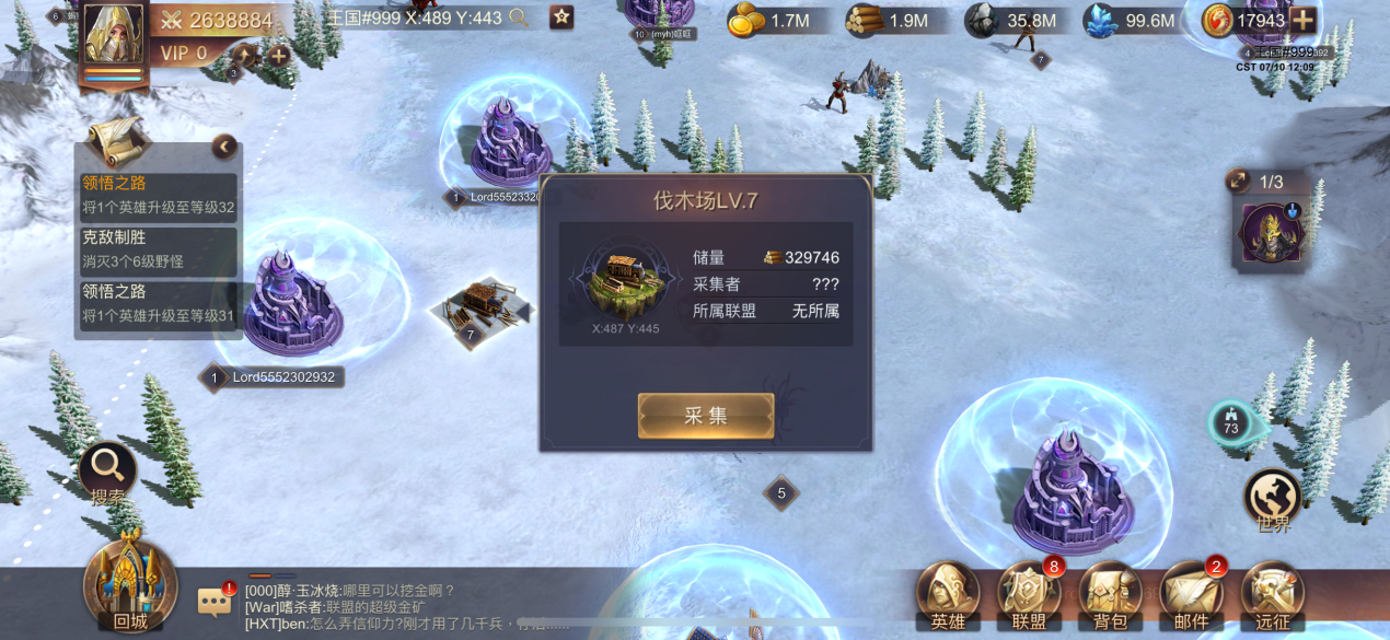 木材是相当重要的资源,不管前期后期都是不可或缺的存在。木材资源的获取不仅能够通过城内伐木场获得,还能够通过占领野外伐木场获得。在野外通过搜索就能够搜寻到一级至七级的伐木场,点击采集便能派遣军队前去占领采集。