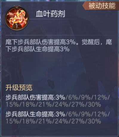 对敌人有debuff,那对己方自然也会有增益!血叶药剂则是莱托兹费劲心力为地下城部队制作的增益药剂,服用后在战斗中,能提升步兵部队的伤害,觉醒后更能提升麾下步兵部队的生命值,提升战斗中的武力和耐力,或许是莱托兹深谙的取胜之道吧。