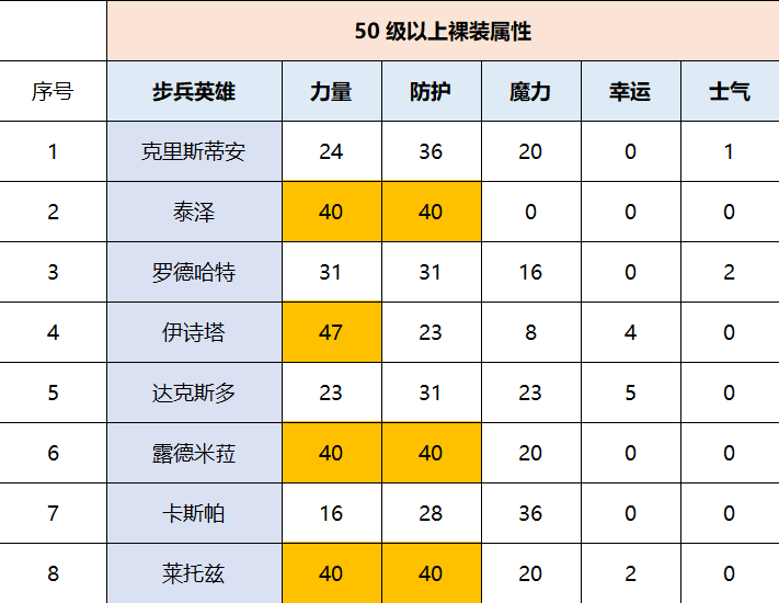 注:以上数值为裸装英雄,实际效果还将受到装备和其他影响,不过底子够好,培养起来也更容易些。