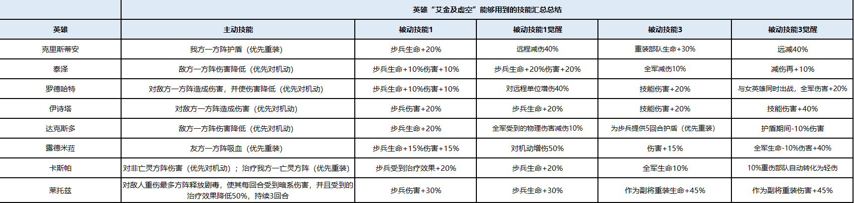 有人喜欢默默成长,有人喜欢打团,时刻准备“艾金演武”和“虚空之战”的伙伴可能更关心技能效果,从上表可以看出:1) 克里斯蒂安适合带重装步兵,适合防远程部队,所以,比较适合当集结的前排部队英雄,肉盾的实力不俗。
